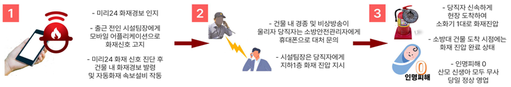 본 건물에 미리24가 설치되지 않았다면 당직자는 우선 수신기로 달려가서 경보를 정지시키고 다시 해당 구역으로 가서 화재 여부를 확인하는 과정을 거쳤을 것이고 화재 였다면 다시 수신기로 와서 경보를 발령하는 조치를 취했을 것임. ( 이렇게 되었다면 화재는 이미 크게 번지고 산후조리원에 입원중인 신생아와 산모의 대피가 늦어져 끔찍한 재난이 발행했을 수 도 있었음)